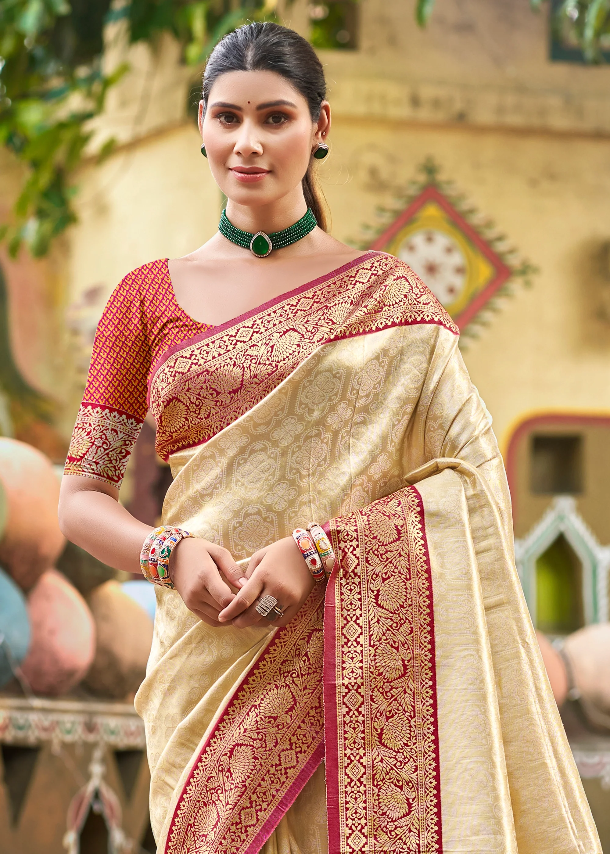 Beige & Red Woven Kanjivaram Silk Saree