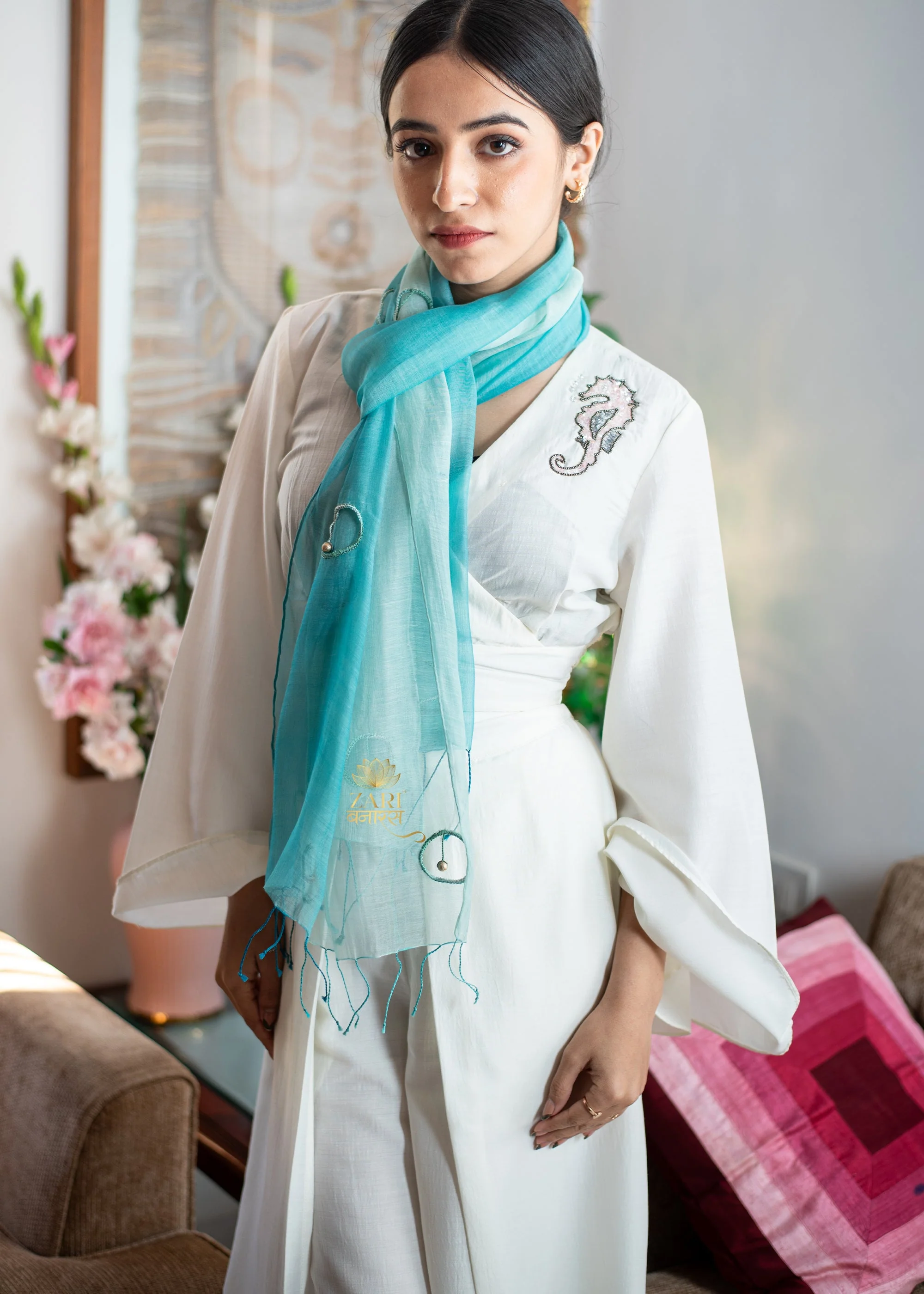 The scarf features a mesmerizing blend of soft, translucent teal and turquoise hues, reminiscent of tranquil waters. This scarf is a testament to the beauty of simplicity and the power of subtle design.