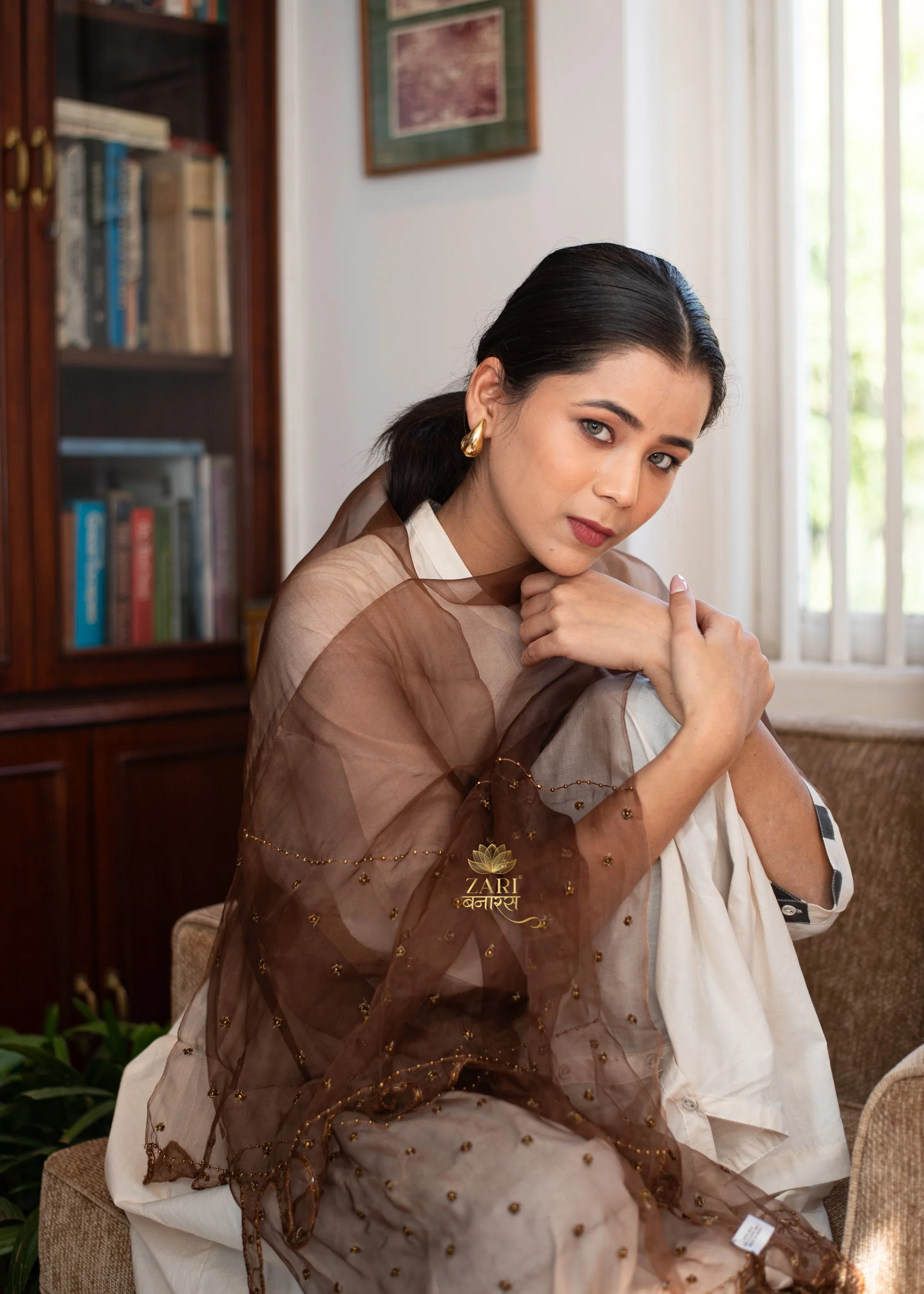 The fringe details are intricately crafted, with a scalloped edge adorned with more golden beads, creating a rhythmic, textured border. This unique fringe treatment adds a touch of artisanal charm to the scarf. The interplay of the warm sienna hue, the delicate beadwork, and the luxurious silk fabric creates a piece that is both elegant and captivating, a testament to the beauty of handcrafted textiles.