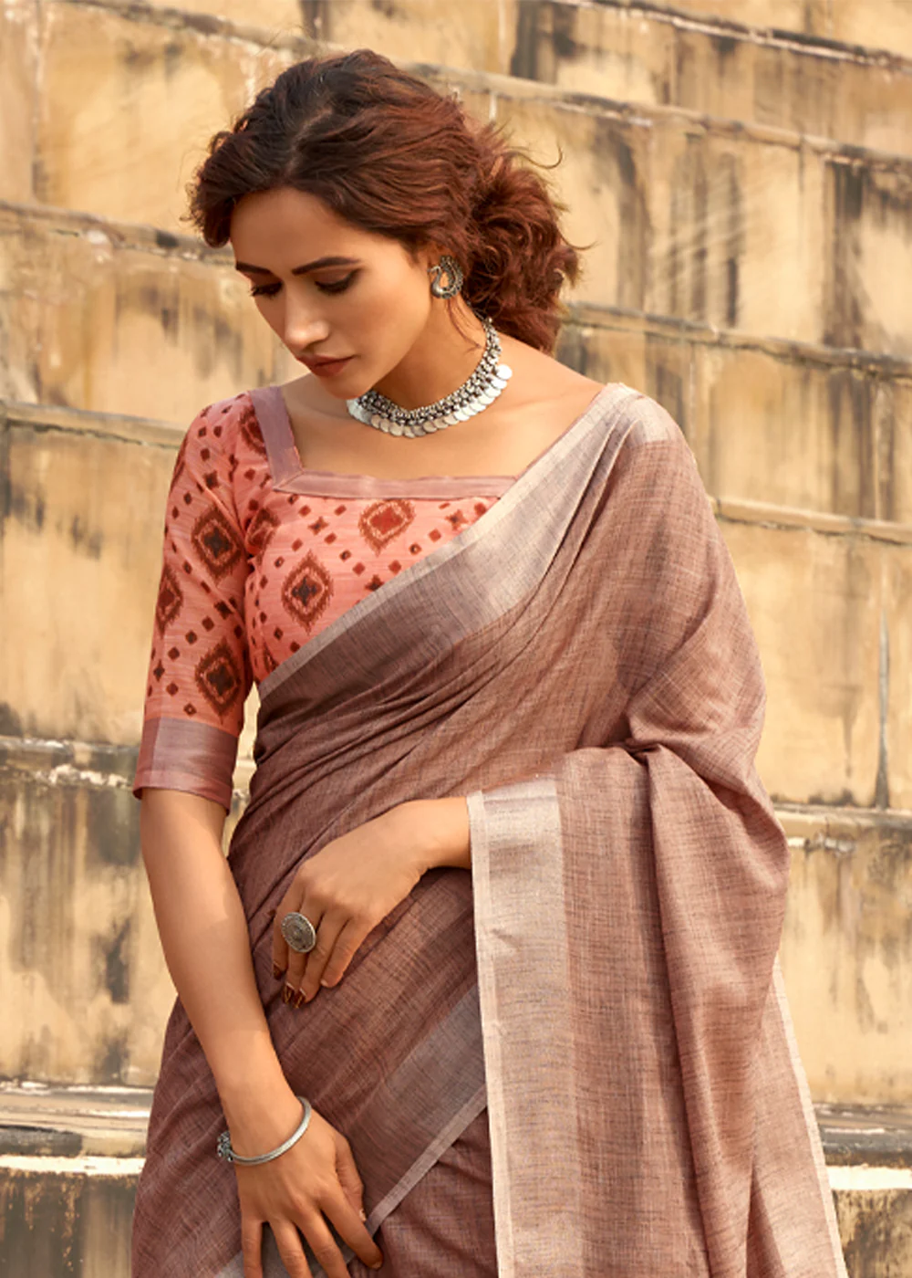 -70%Earthy Brown Woven Linen Saree With Khadi Print Blouse—