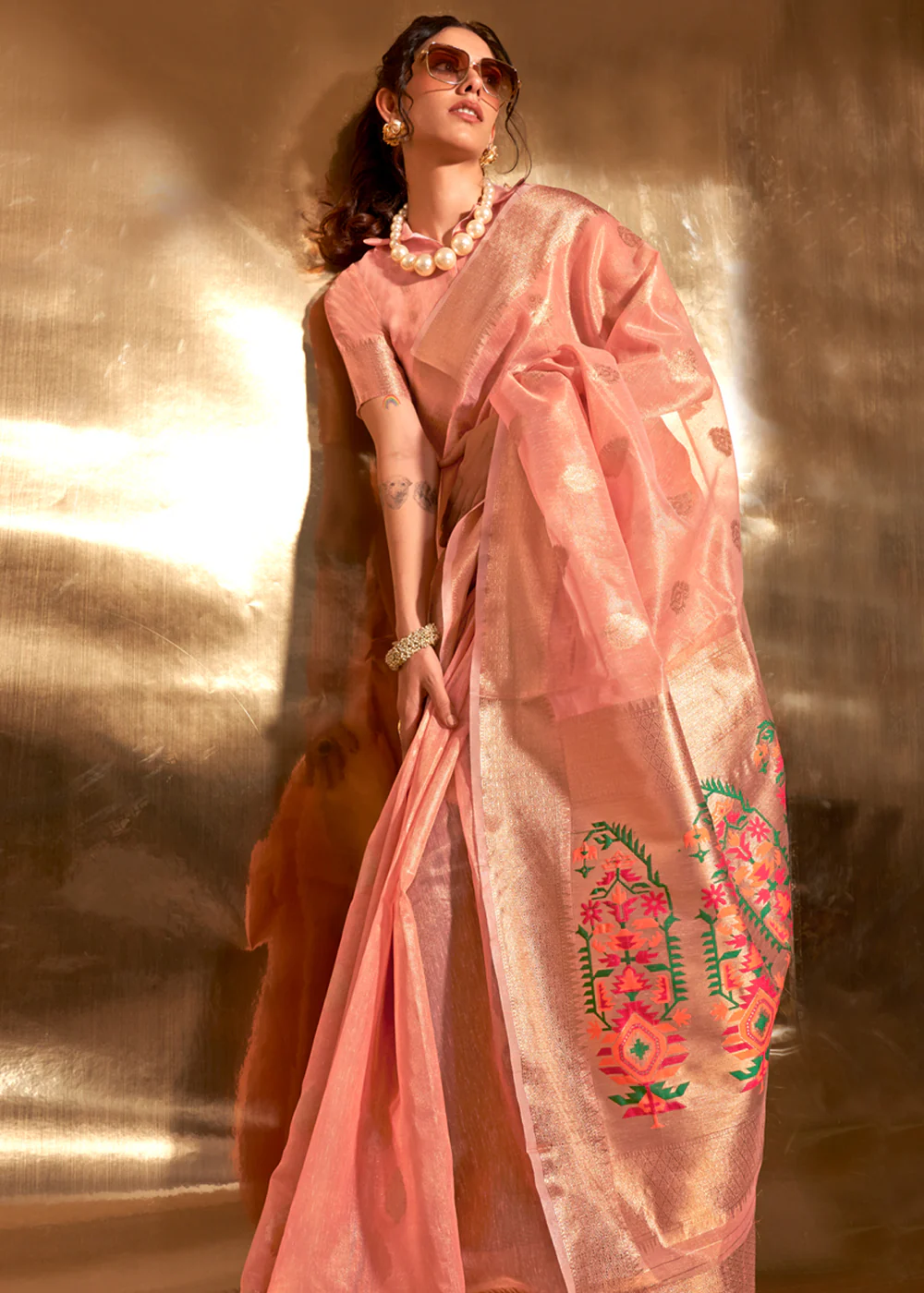 Gooseberry Peach Woven Banarasi Tissue Silk Saree