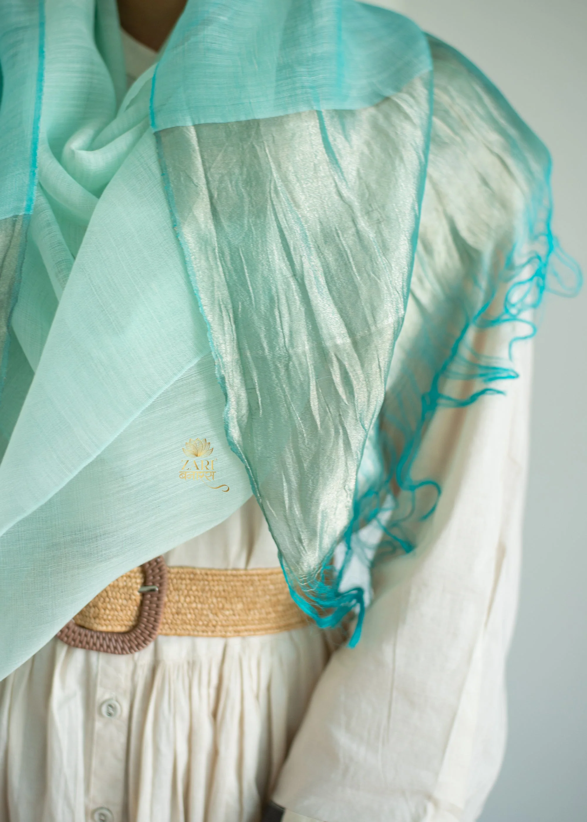 This handcrafted scarf, woven with 40% metallized yarn and 60% cotton, presents a palette of soft turquoise and subtle silvery grey. The turquoise, reminiscent of tranquil waters, flows across the fabric, creating a sense of movement. The metallized yarn adds a delicate shimmer, catching the light like sun on water.