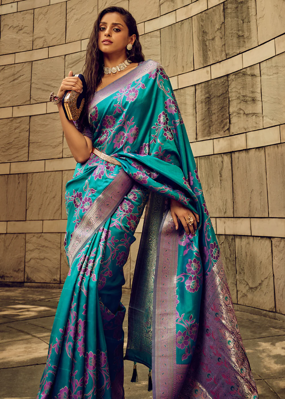 Peacock Blue Woven Satin Silk Banarasi Saree With Brocade Blouse