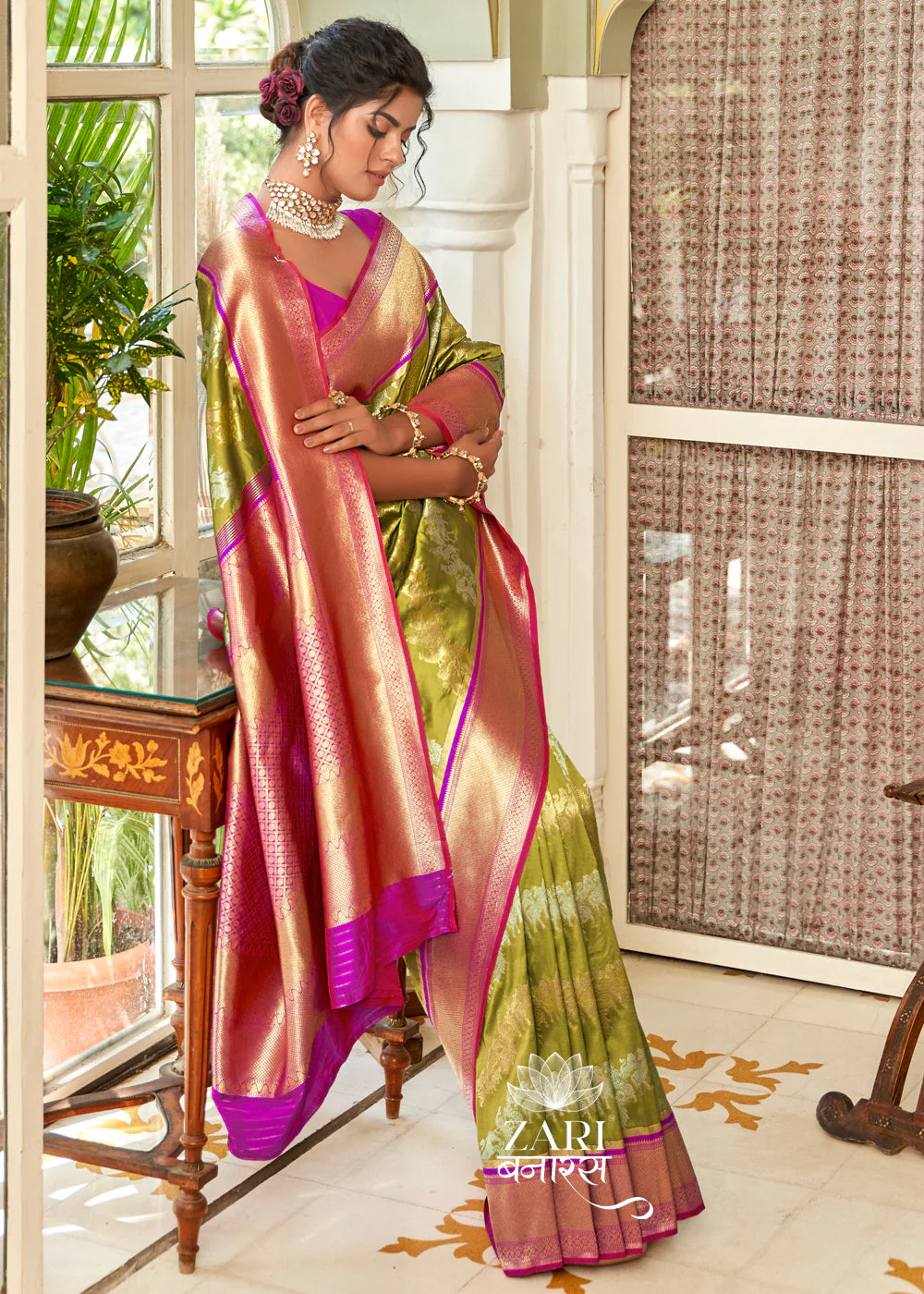 The saree comes with its own blouse piece. The model is wearing a separate blouse for styling purposes.