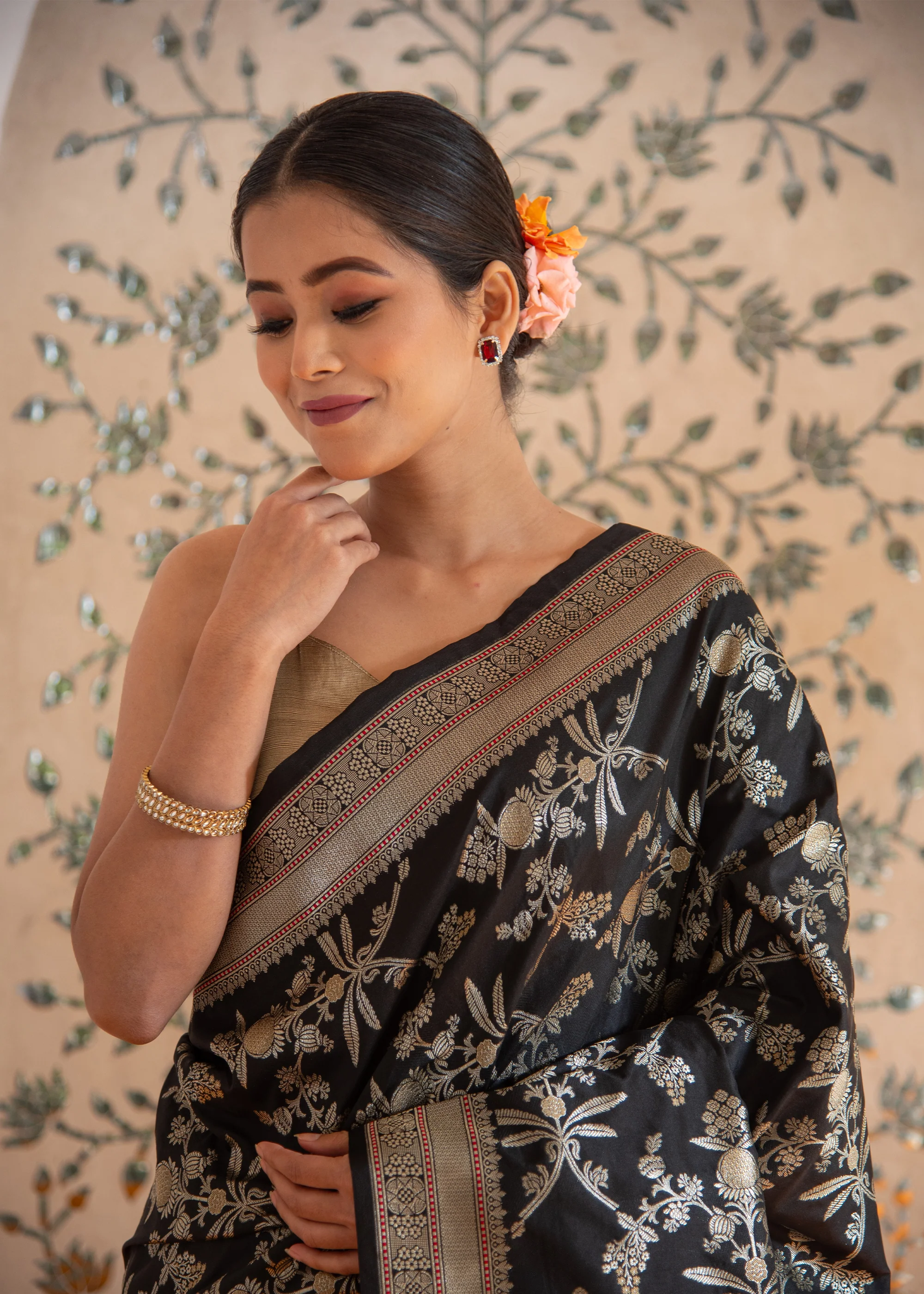 Let the delicate petals and the alluring fragrance of the night bloom guide you through a journey of elegance and sophistication. Immerse yourself in the splendor of the Silver Bloom saree, where you can revel in the harmonious blend of tradition, luxury, and everlasting floral allure.